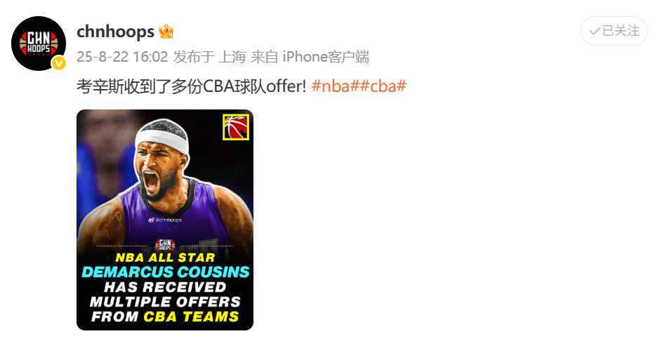 雷速体育8月22日讯 根据媒体人@chbhoops报道:NBA全明星考辛斯收到了多份CBA球队offer。