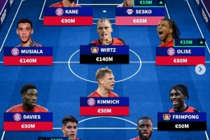 体育资讯3月27日讯 德国转会市场公布了德甲最贵阵,凯恩领衔的拜仁6将入选,维尔茨、塞斯科在列。